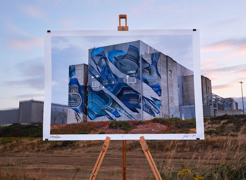 Many of the locations featured in Impossible Street Art are not neutral backdrops. They are sites of ongoing environmental and social tension. The nuclear power station depicted in Skirl’s contribution, for example, is situated near a protected landscape on England’s east coast, where debates about expansion and ecological impact continue to unfold.