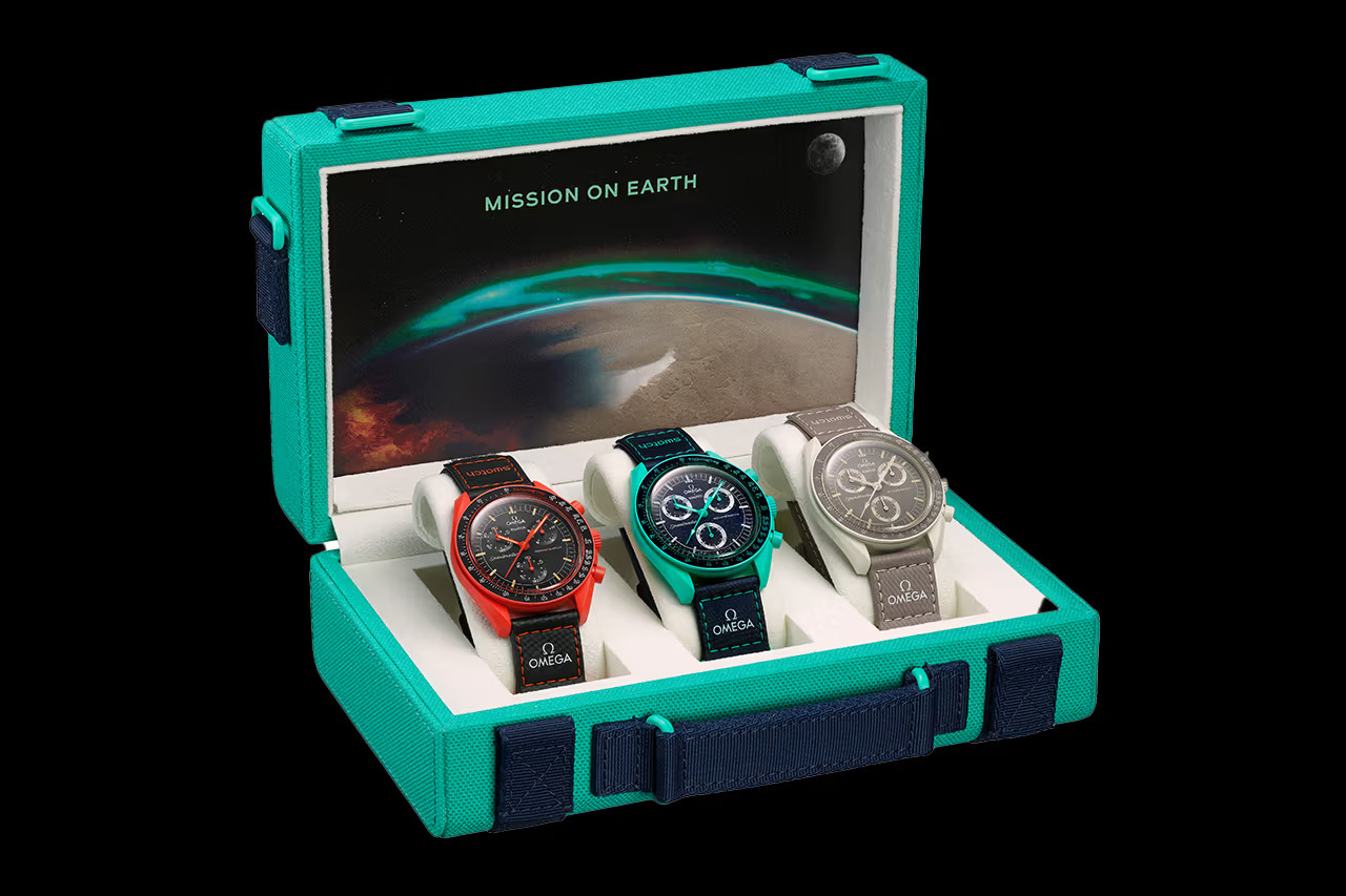 Every MoonSwatch since the surprise 2022 debut has focused on the celestial. With the new round of “Mission on Earth” models, Omega and Swatch are honoring their home planet. The Polar Lights model has an eye-popping 42mm, bioceramic turquoise case paired with an aventurine-inspired dial, the Lava, a bright orange case of the same size and material, and Desert, a relatively calm pairing of a sand-colored case with a taupe dial. All three are powered by quartz chronograph movements and will be available at select stores on Saturday, June 15th.