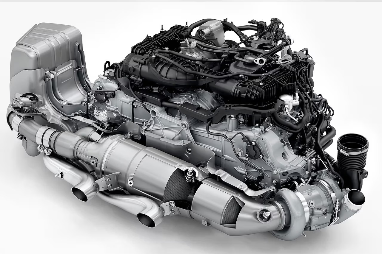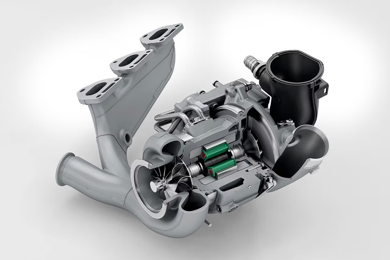 At the heart of the new 911 Carrera GTS is a newly developed 3.6L boxer engine combined with a high-voltage electric exhaust gas turbocharger. This system not only enhances power delivery but also improves efficiency. The electric turbocharger, integrated with an electric motor, generates up to 15 hp of electric power from the exhaust gas flow, eliminating the need for a traditional turbo setup.